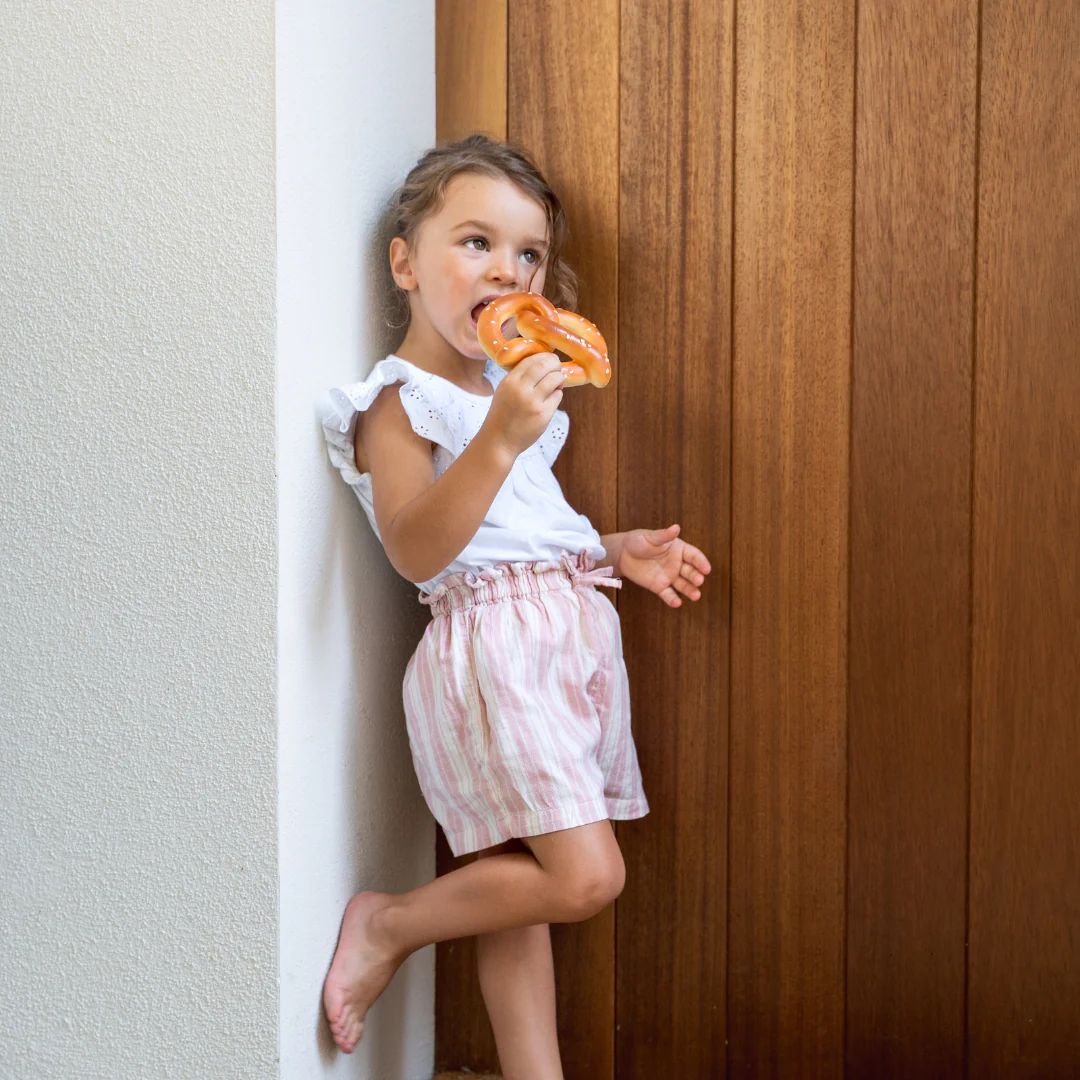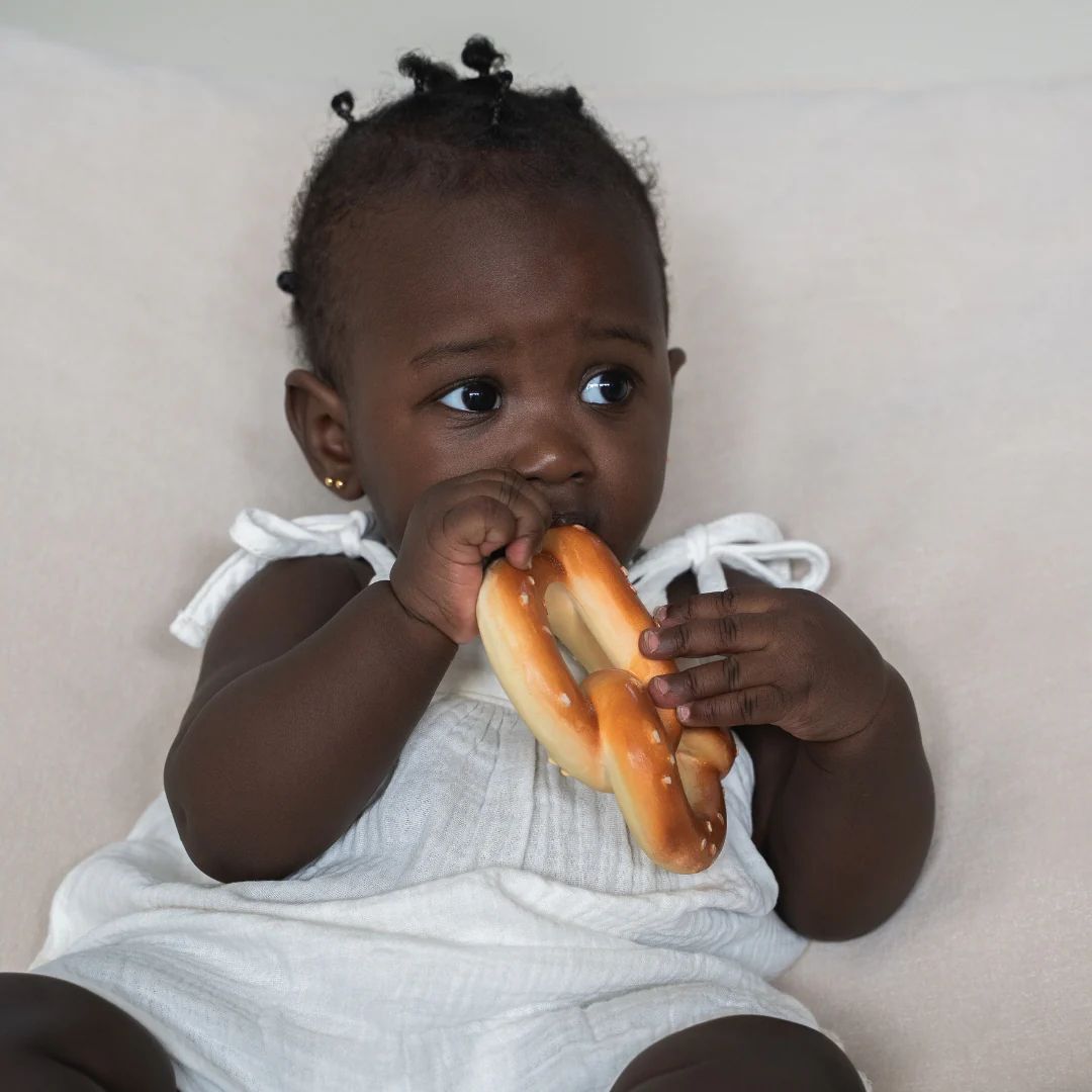 Pepe le Pretzel es un mordedor con forma de pretzel que alivia las molestias de la dentición gracias a su textura suave y realista. Su diseño curvado con huecos facilita el agarre con ambas manos, permitiendo que el bebé lo explore cómodamente. Inspirado en el simbolismo del pretzel, abrazos y unión, transmite calma y ternura mientras fomenta el juego y el descubrimiento. Además, estimula el desarrollo sensorial y la coordinación mano-boca. Es un accesorio versátil que puede utilizarse como mordedor, juguete sensorial, de baño o elemento decorativo. Dimensiones: 10 x 13 x 2 cm (aprox.).